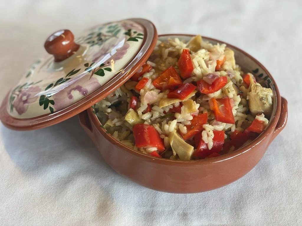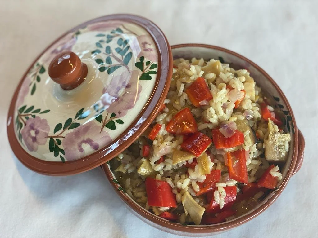 Paella met spitskool, pancetta, tuinkruiden en kip