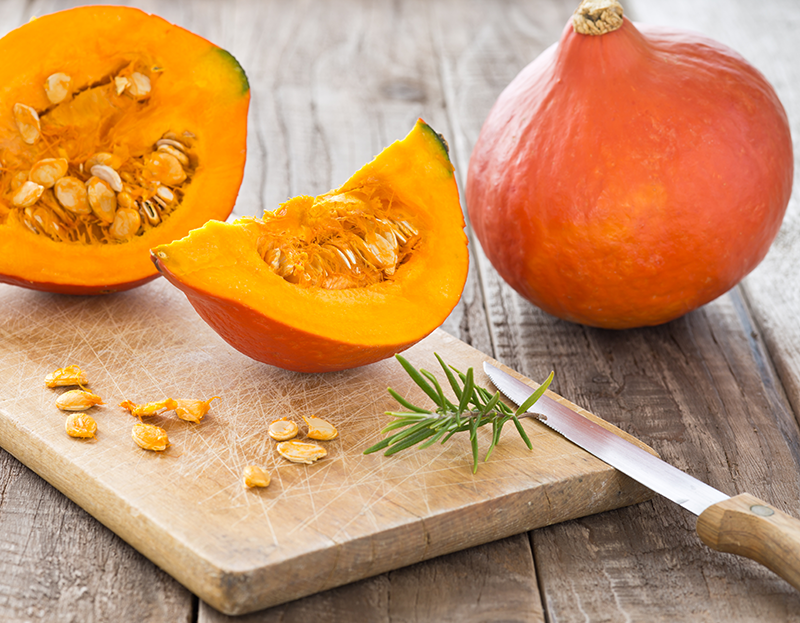 Winterse groentenschotel met Hokkaido pompoen, boerenkool, bloemkool, shii-takes en worst