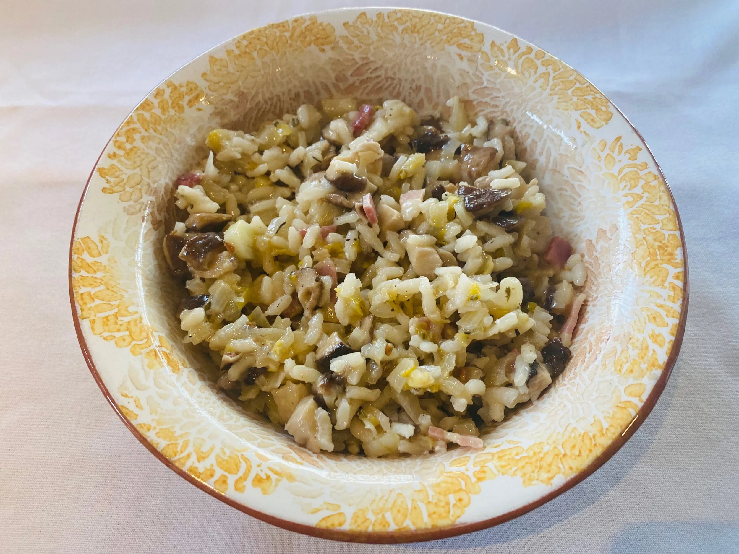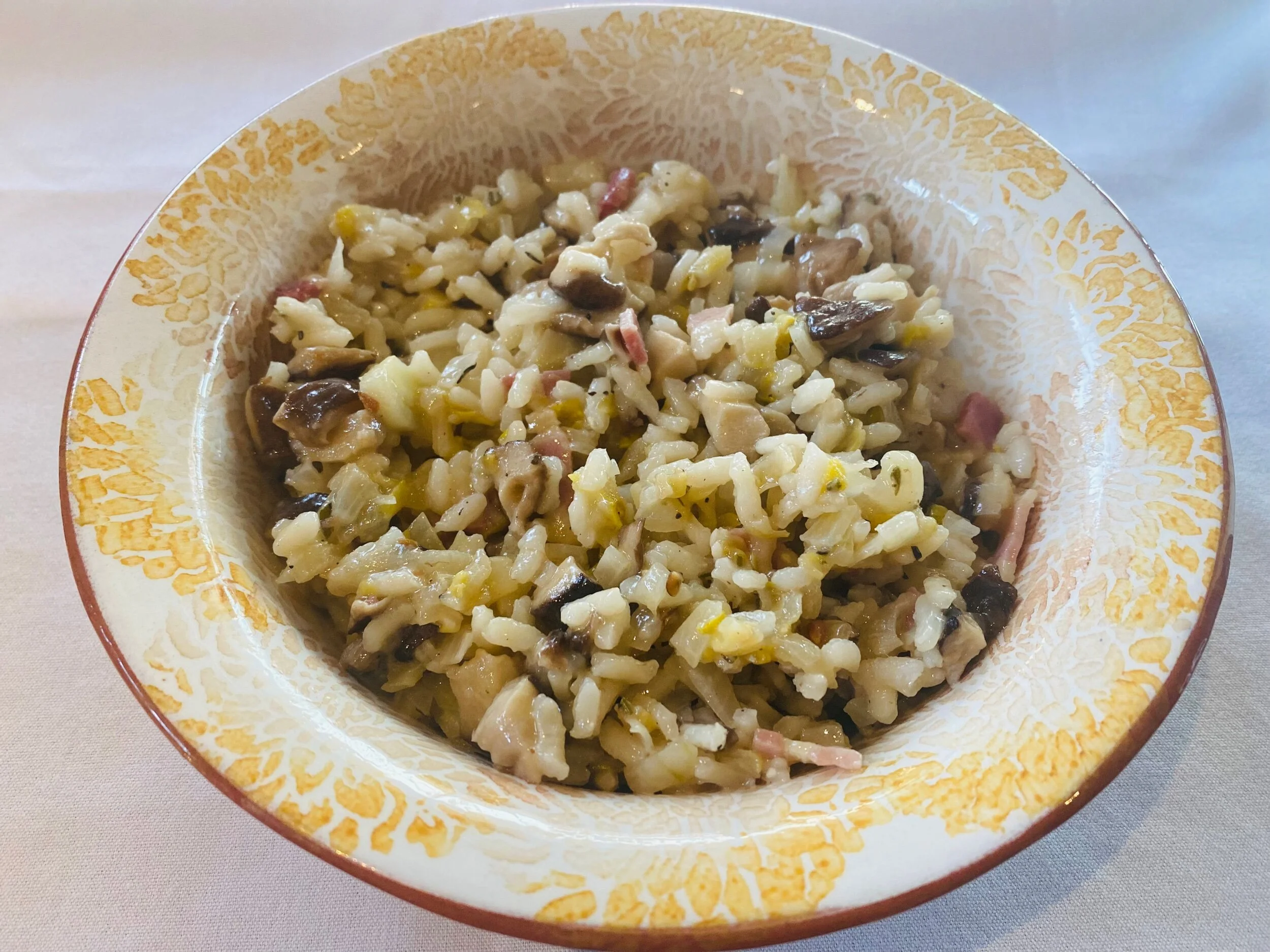 Pompoen risotto met bio kip, shiitakes en palmkool gegaard in huisgemaakte kippenbouillon
