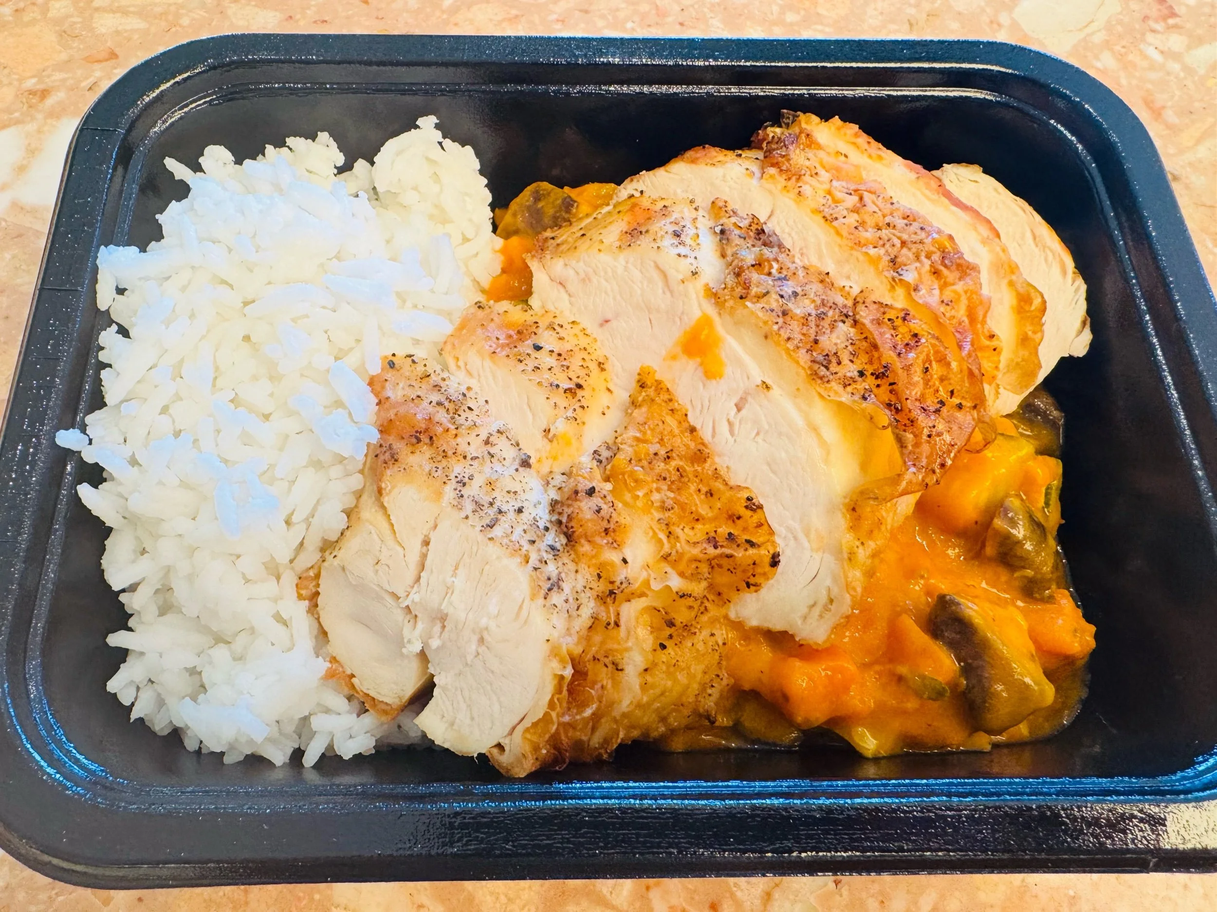 Kipfilet op een bedje van rode paprika, shii-takes en winterpostelein met een kruiden puree