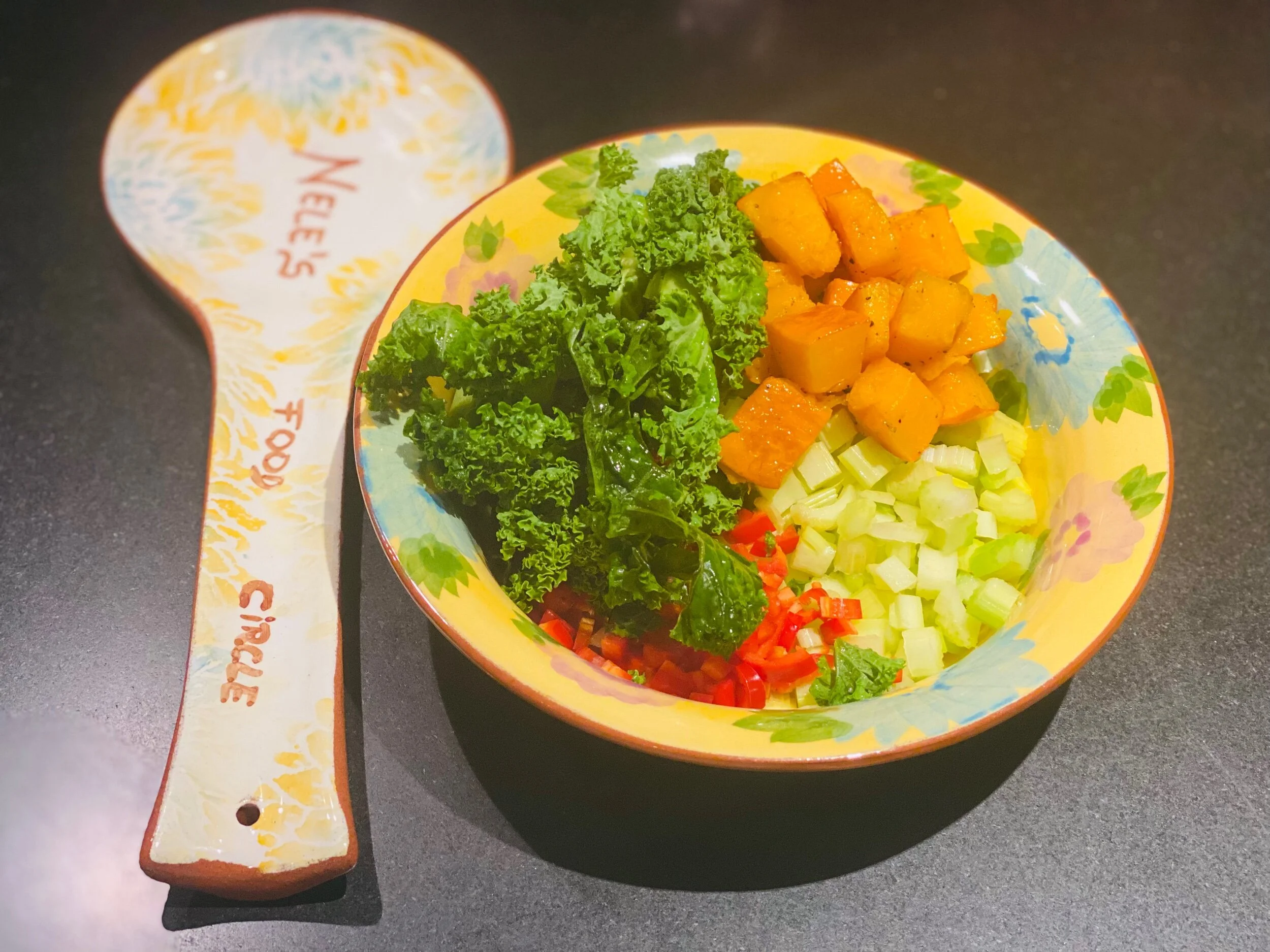Een winterse lasagne boordevol groentjes die je energie geven! Lasagne is gemaakt met glutenvrije pasta, pompoenpuree, palmkool, een tomatensaus met varkensgehakt, komijn, chilipeper en selder. Afgewerkt met Emmental kaas als krokant korstje.